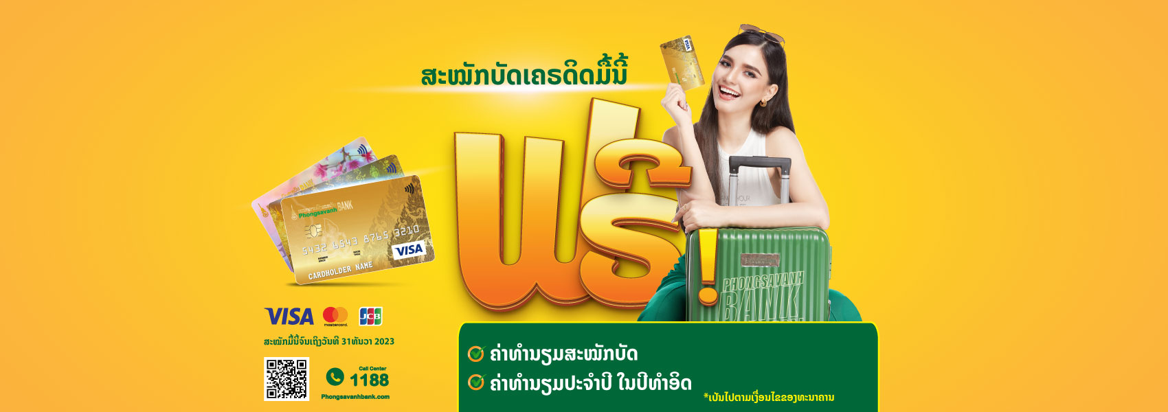 - ສະໝັກ 3 ບັດ: Visa/Mastercard/JCB ຟຣີຄ່າທໍານຽມສະໝັກບັດ ແລະ ຄ່າທໍານຽມລາຍປີ, ປີຕໍ່ໆໄປຊໍາລະຄ່າທໍານຽມລາຍປີພຽງບັດດຽວ;